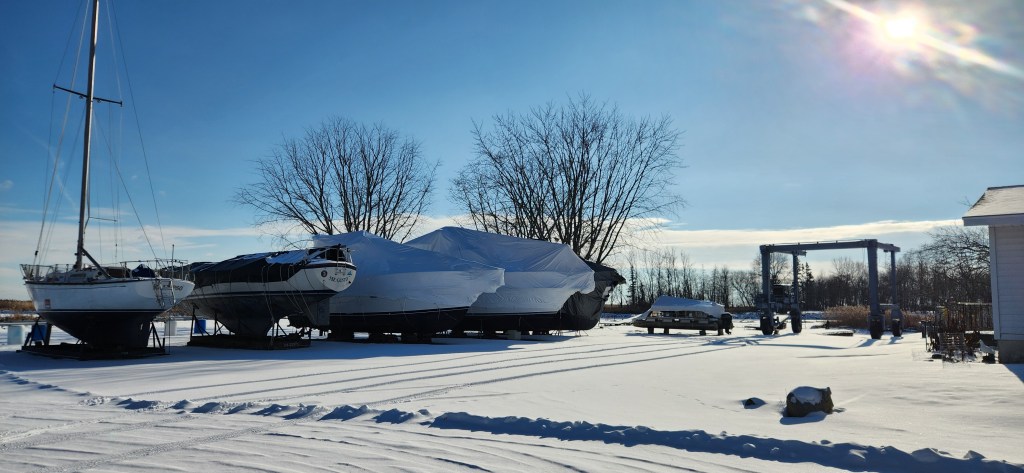 Well, here we are. Deep in the throes of winter. Another day with nothing to do but to sit around and eat, drink and try not worry about my boats sitting outside on the hard. This morning here in Wisconsin I woke up to -5 degree temps with the forecast calling for -9 degrees for a high in a couple of days from now. I can’t help but worry a little bit about my boats, Comptime V and Nauti Pickle being exposed to such cold weather. Both are covered to protect the exteriors from the snow sitting on them, but I am still a little concerned about the extreme weather affecting such things as the fiberglass, the engines, and the water system. Judy and I work very well as a team and are meticulous when it comes to winterizing our boats. Double checking each other on the tasks and always adding a little bit more anti-freeze than is probably needed. Still, it’s going to be darn cold out this week. Will the anti-freeze do its job and protect our investments? I’m pretty sure I will be taking the four-hour round trip up to the boat sometime next week just to look things over. The alternative would be to lay in bed each night and lose sleep wondering. I will let you know how it turns out.
