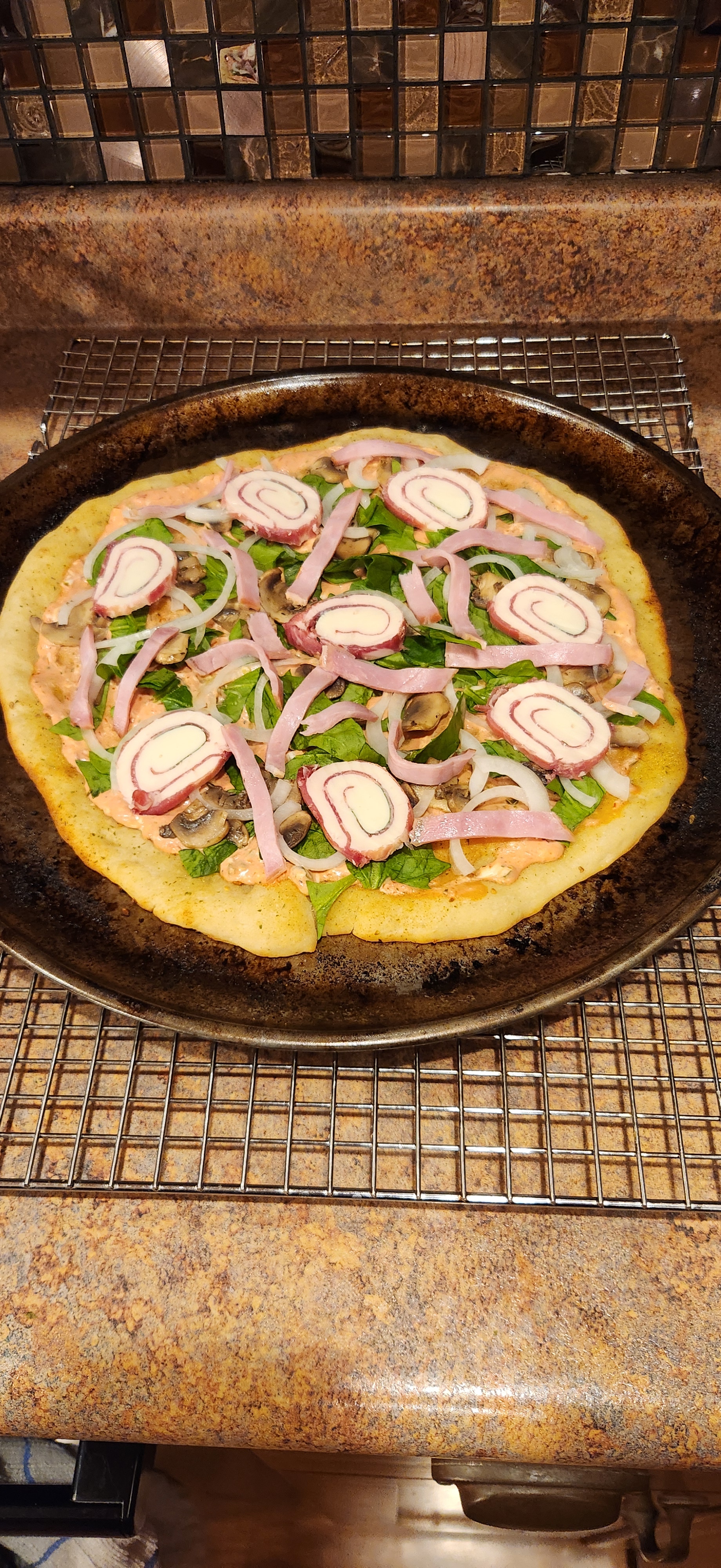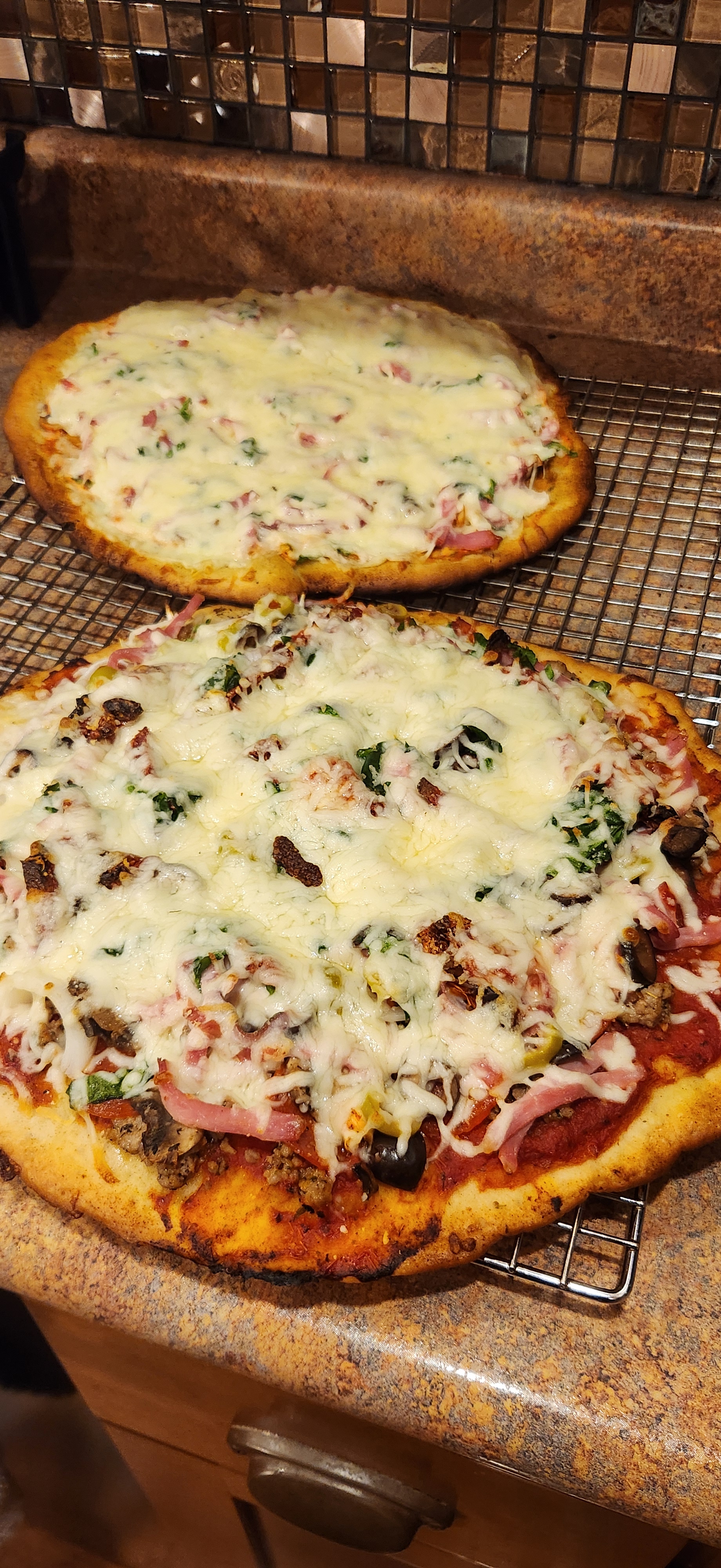 Now, let’s talk about the King Arthur flour I mentioned earlier. Be it bread flour or all-purpose flour, King Arthur has a higher protein content, producing crusts with good flavor, nicely crisped surfaces, and a satisfying chew. I recently visited and created an account at the King Aruthur Baking website and found an AMAZING new pizza crust recipe. Well, let me tell you, I have never made a crust like this one. Talk about sticky dough! There were a few times where things could have gone bad quickly if it were not for Judy helping me. The dough itself has two 90-minute rest periods along with multiple 15-minute rest periods. The payoff was well worth it! Light, airy, crispy, and not dry or doughy at all. Judy mentioned the test would be how things tasted the next morning. Oh, did I mention, Judy is a cold pizza junkie? It turned out the cold pizza we had for breakfast this morning was excellent.