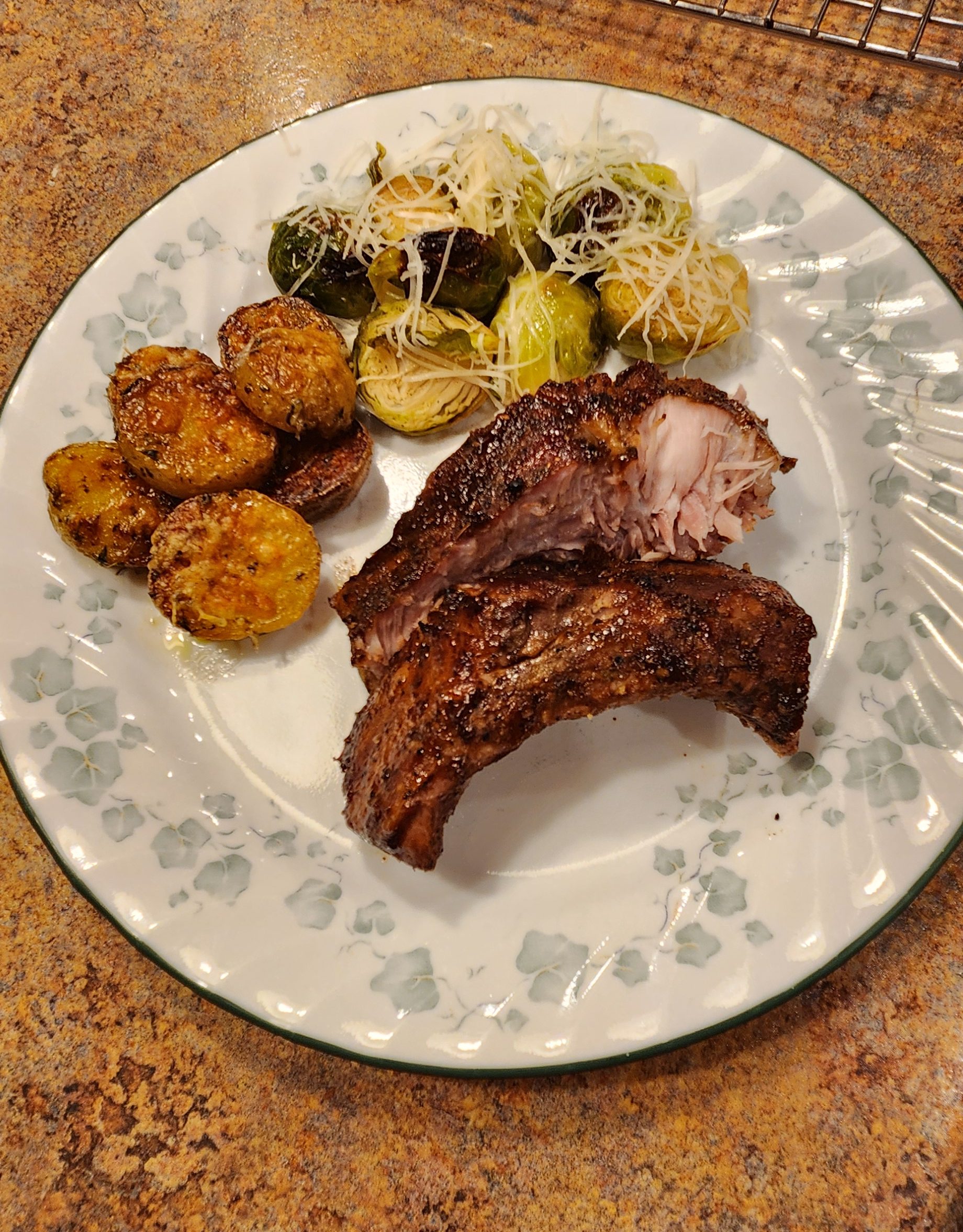 Of course, it would not be a typical weekend at the Rannow’s if we did not try a new recipe. This weekend, we tried two recipes. One for potatoes, and one for ribs. Chris seasoned, sealed, and sous vide ribs at 153 degrees F for 24 hours. Then he took them out of the bag, dried them off, seasoned them again, lightly brushed on BBQ sauce and broiled them on high for 2 1/2 to 3 minutes until the BBQ sauce charred. To go with the ribs, we made Garlic-Parmesan Melting Potatoes from EatingWell and Brussels sprouts with parmesan cheese. Everything was delicious. We will definitely make it all again.